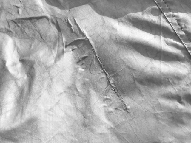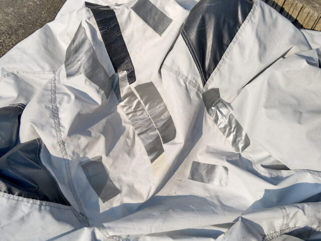 ダイソーの粘着布テープ(ポリエチレン製)で補修してごまかすが、その隣が裂ける始末…もう限界かな。
