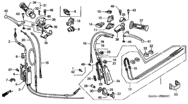 私も TA03(4ストジャイロ)のホイールは流用できないかと考えたのですが、TA02 がブレーキドラム分割式に対して TA03 は一体型。それにどうやらブレーキ関係は全く互換性がなく(ブレーキシューが別物)、ブレーキケーブルの取り回しも違う可能性があります(以下の17番辺り)。
