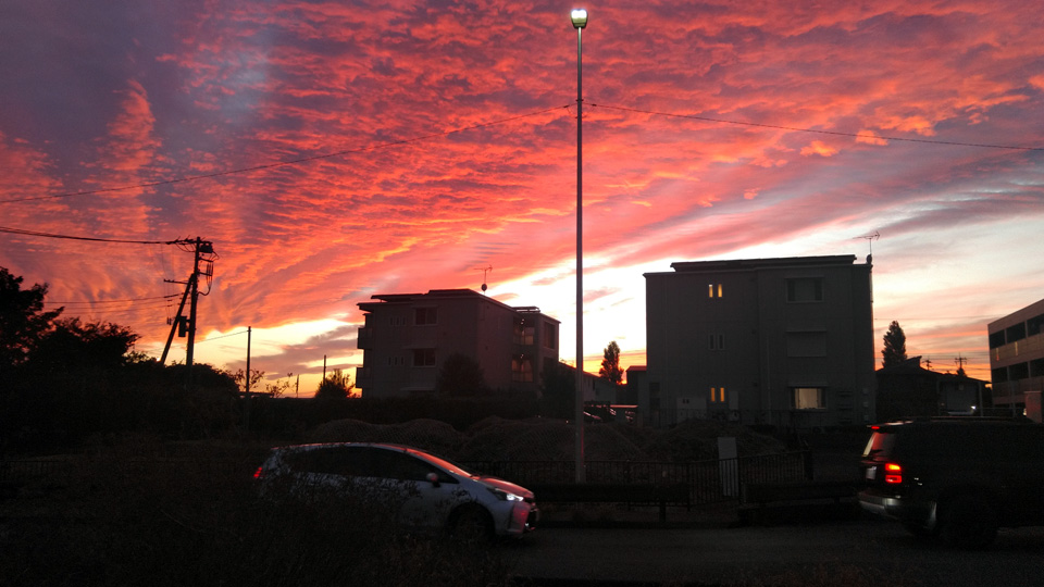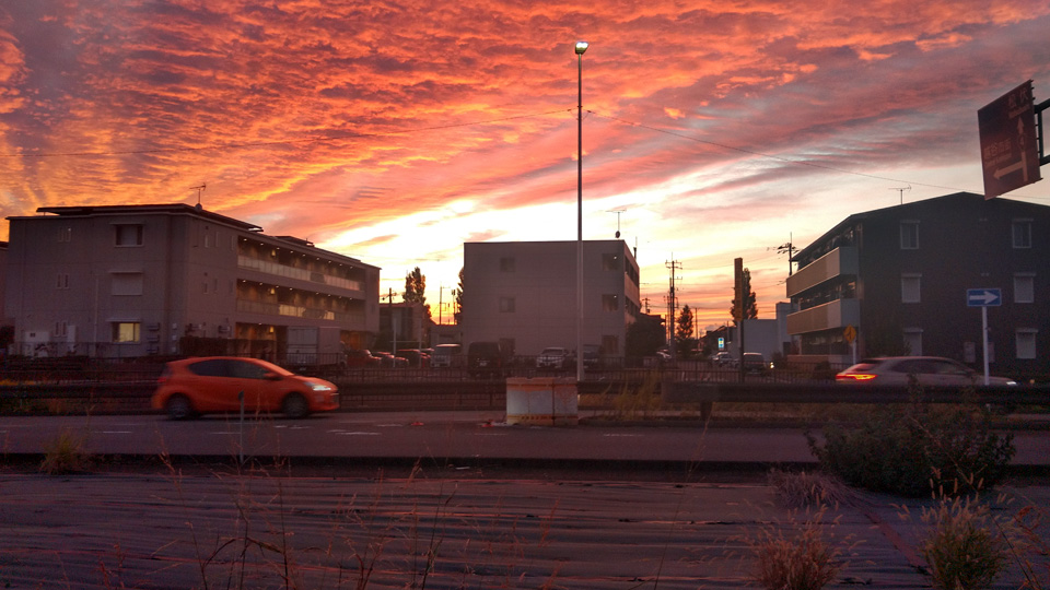 仕事で越谷レイクタウンに行く途中、中高生が空にスマホを向けていた。何かと思ったら見事な夕焼け。