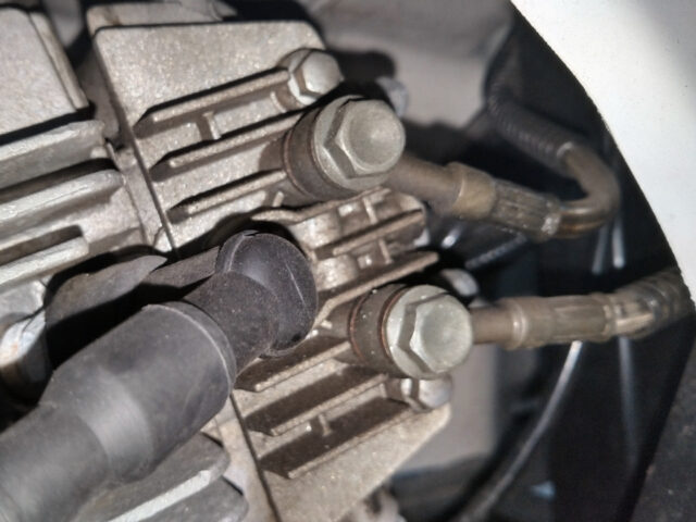 プラグ交換の際にエンジンカバーを外したら、カムヘッドの横からステンメッシュホースが2本前の方に伸びているのを確認。