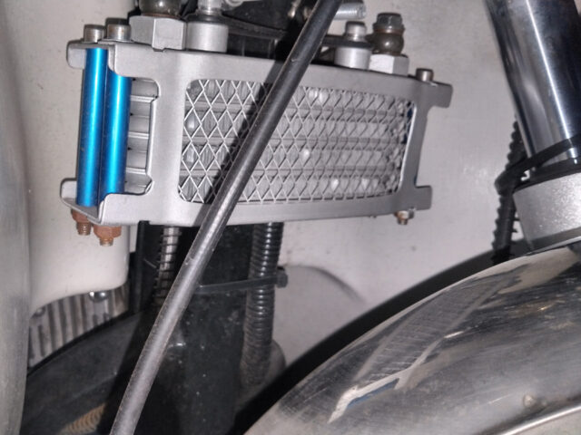 たどったらフロントフォークの奥に割と大きめのオイルクーラーが鎮座していた。これは嬉しい。