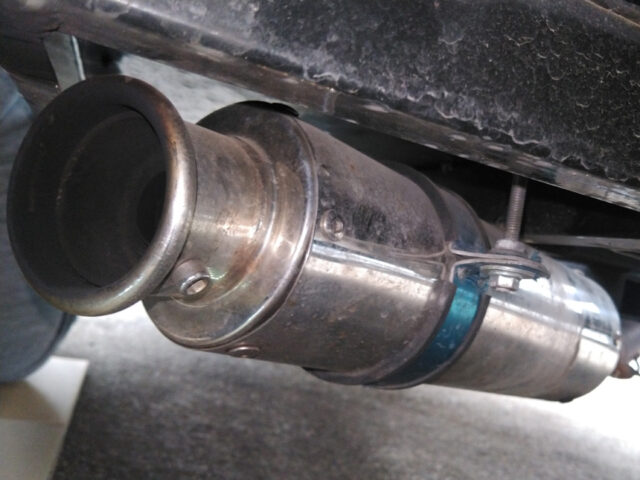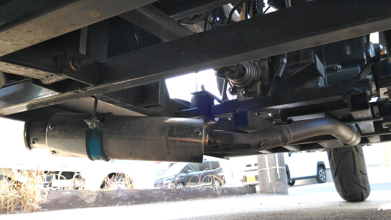 アイドリングや低速走行では気づかなかったが、ブン回すと排気音が結構うるさい。下回りをのぞいて見たらステンレス製マフラー&マニホールドに換装してあった。ワンオフものでどうやら埼玉県寄居町のバイク屋で作られたものらしい。