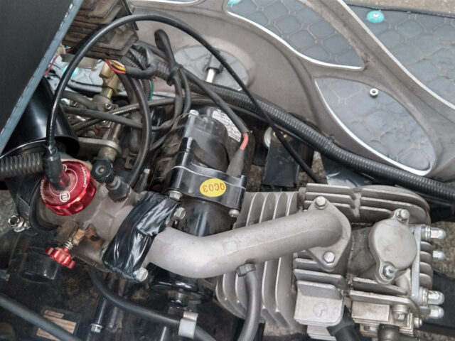なんかスキマから赤いパーツがあちこち見えていたが、排気量アップに伴ってかデカいキャブに交換してあった。