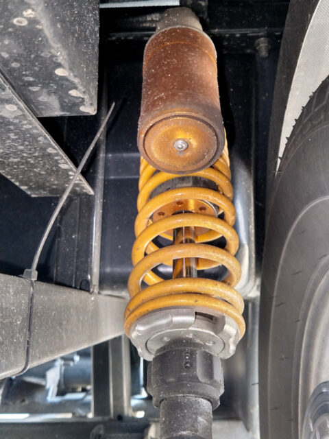 オリジナルのリアサスは硬すぎて評判が悪い。下周りをのぞき込んだら黄色いスプリングが見えた。金色のリザーバータンクが付いていて、オーリンズっぽい何かに交換してあるようだ。もちろん、本物ではない。