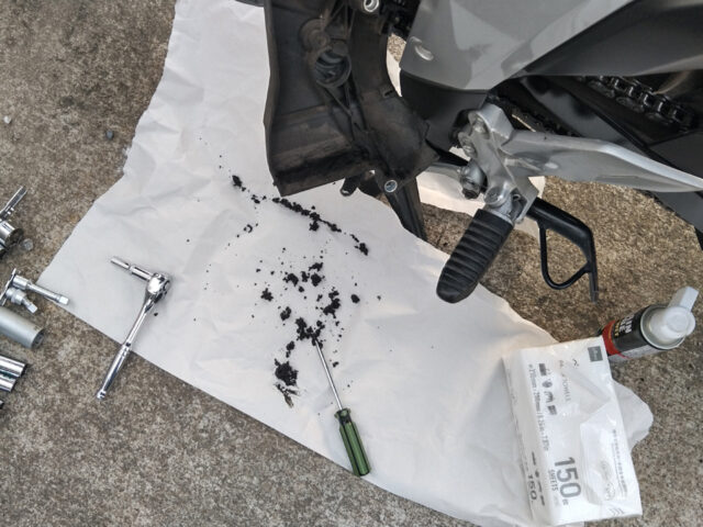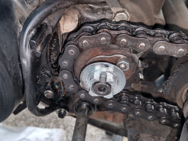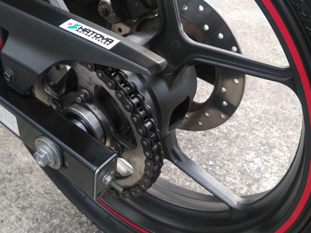 ついでにドリブンスプロケット周りもしっかり清掃してグリスアップ。チェーン張り調整もバッチリ。これで当面の心配がなくなった(→チェーン張り調整はこちら)。