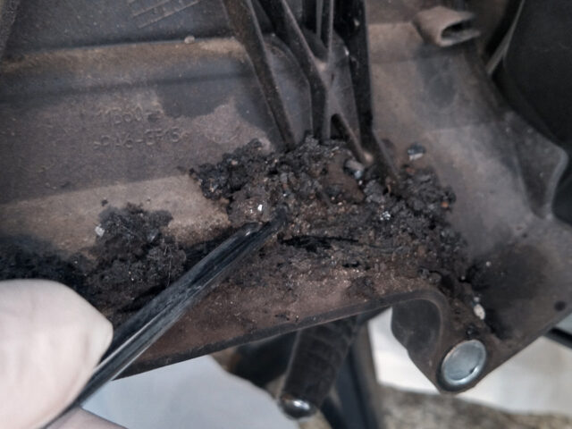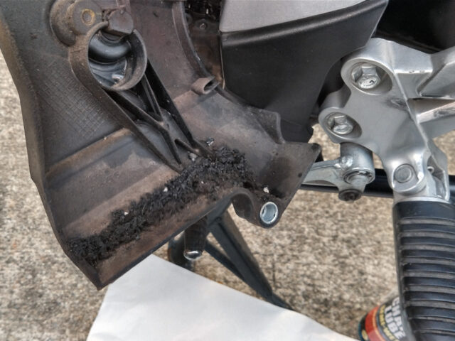 ホコリや砂を含んだチェーングリスが粘土のように固まって内側に溜まっていた。