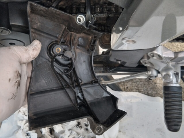 掃除が終わったら周りの配線が嚙まないよう注意してカバーをかぶせた。ボルト穴に金属製のカラーが入っているとはいえ、プラなのでボルトを強く締め付けると割れてしまうかもしれない。ラチェットだと力が入りすぎるので、締め付けはホドホドに。