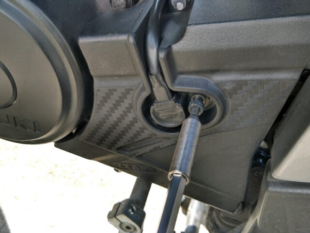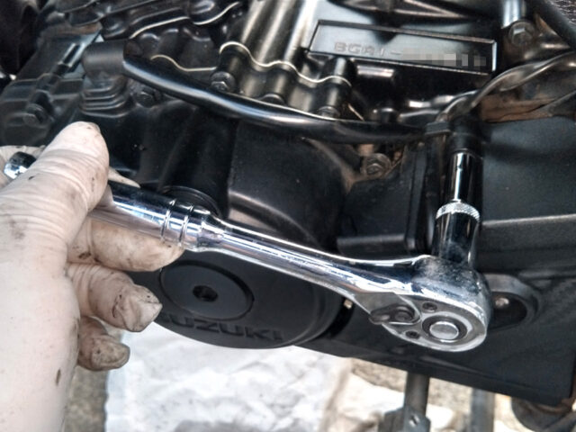 エンジン出力側のスプロケを露出させるには以下2本のボルトを緩めてカバーを外すだけ(と、偉そうに書いているが手探りでやってわかった)。