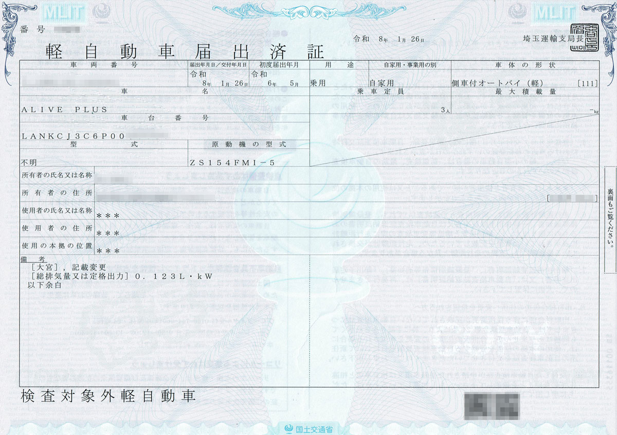 APtrikes125 の軽自動車届出済証(車検証)はこんな感じ