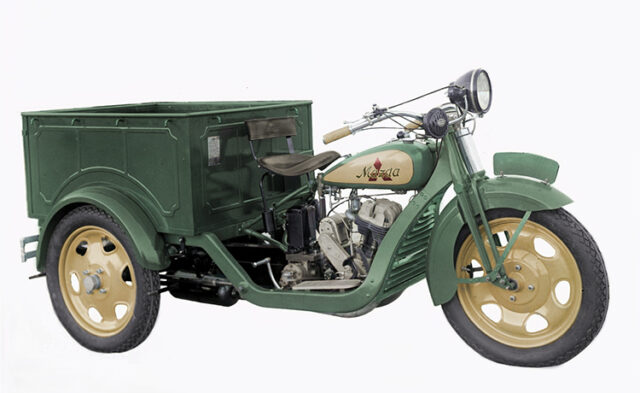 そのうち雨風しのげるように屋根が付いたりドアが付いたりしてオート三輪と呼ばれるようになり、日本のモータリゼーション黎明期、二次大戦後の復興の足として大活躍。回転半径が小さいので細い路地や山道などで重宝がられた。